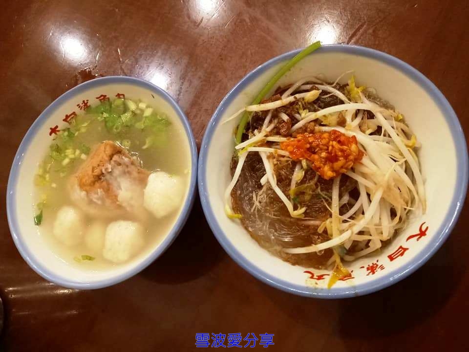 在基隆麵攤很常見的乾冬粉,一般的乾冬粉,頂多加點油蔥酥與醬油提味,「大白鯊」的乾冬粉,則淋上些許肉末滷汁,