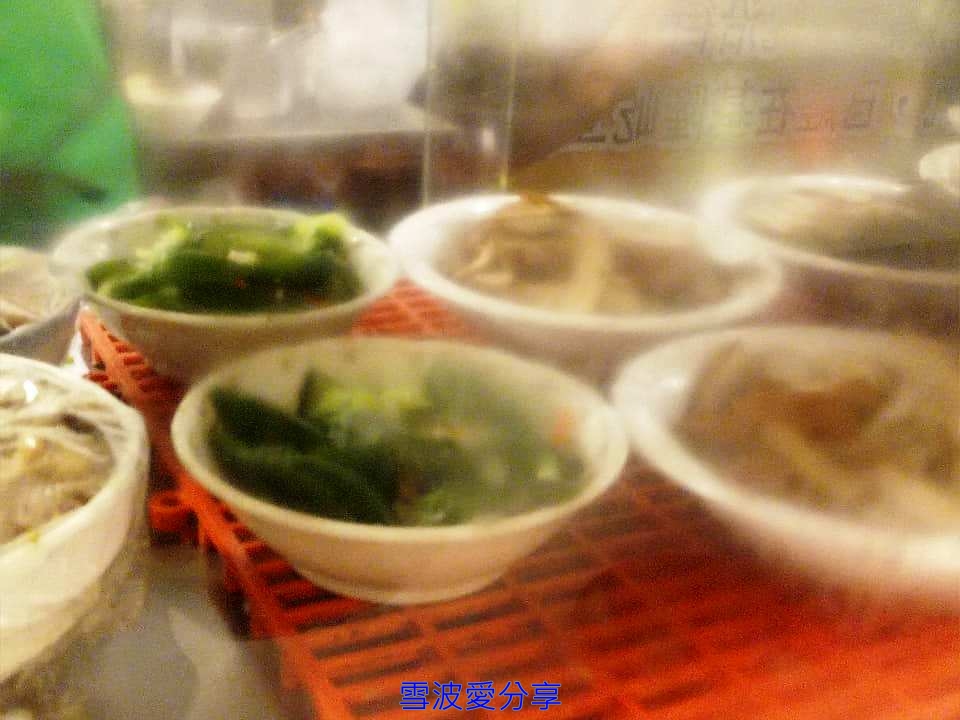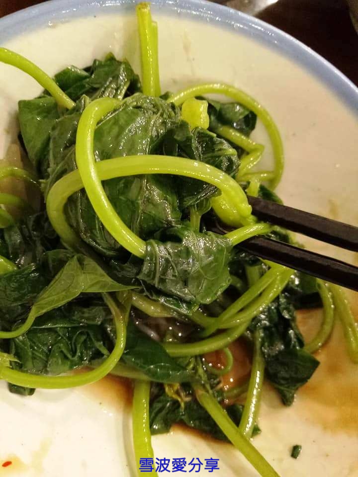 「大白鯊魚丸」的燙青菜,也與乾冬粉一樣,使用同樣SIZE的碗裝,一般他們會提供兩種大家常吃的青菜,(大陸妹與空心菜)為主,這次我點了地瓜葉。碗裡裝著滿滿的地瓜葉,淋上店家特製醬油,看了就讓人覺得很好吃。