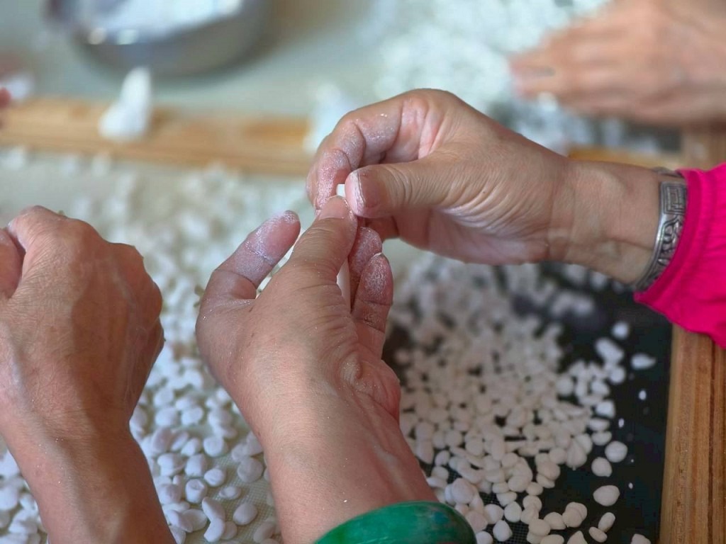 夏日午後,母女、婆媳或鄰居妯娌會圍在竹篩旁,一邊聊天、一邊快速地扭著白丸,就像是在交換彼此的心事與日子。