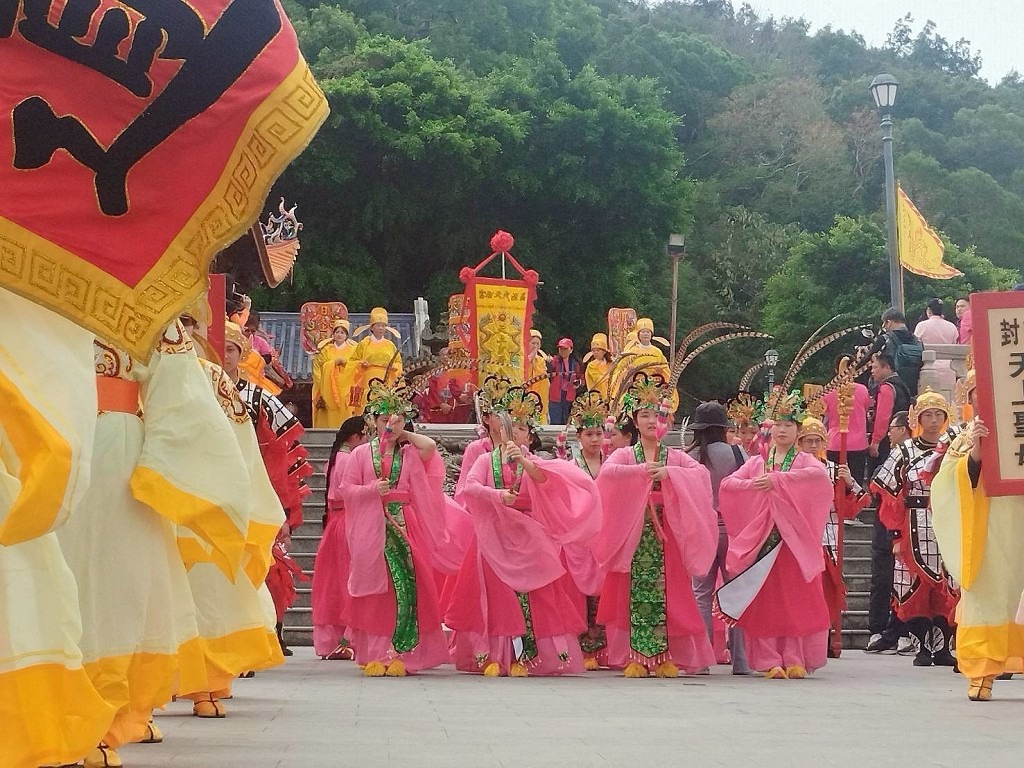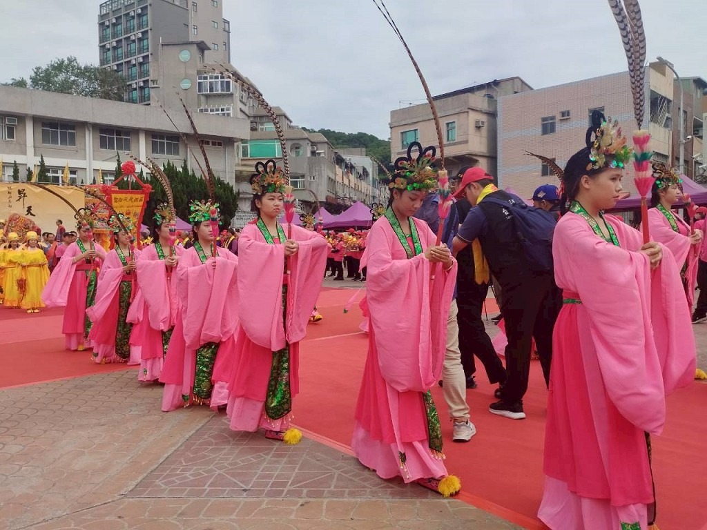 天后宮前鼓聲齊響,天庭仙女與天兵天將身著華服,手持七彩旗幟與儀仗緩緩進場。